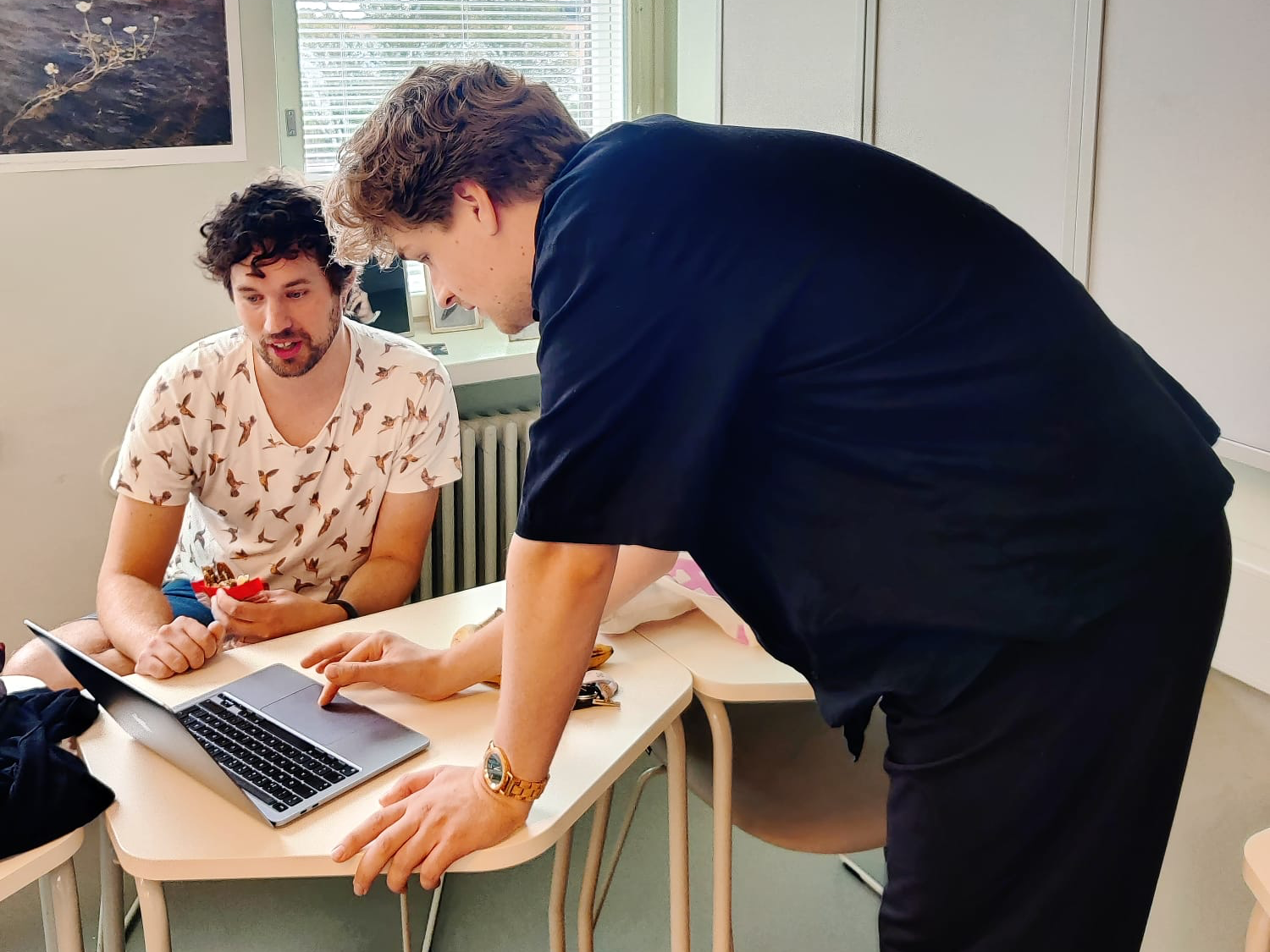 Janne Salmenkangas ja Petja Ylärakkola tutkivat laulusarjan pianostemmaa harjoitusten yhteydessä. Kuva: Wille Enckell.